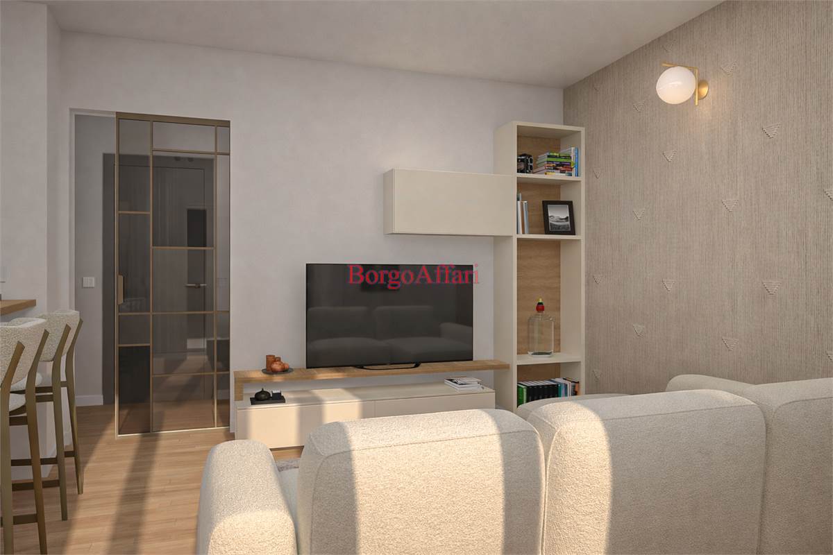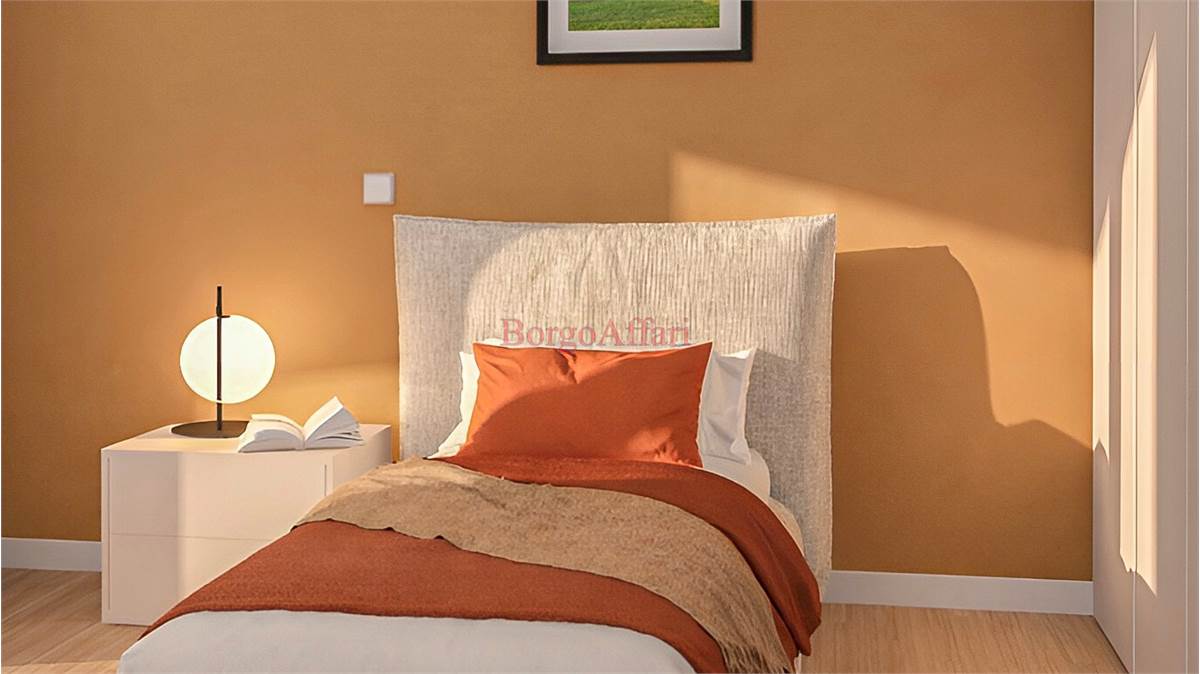 L'appartamento sarà così suddiviso: ampio salone con cucina a vista e zona pranzo, disimpegno che porta alla zona notte con una grande camera matrimoniale, camera singola e un bagno spazioso.